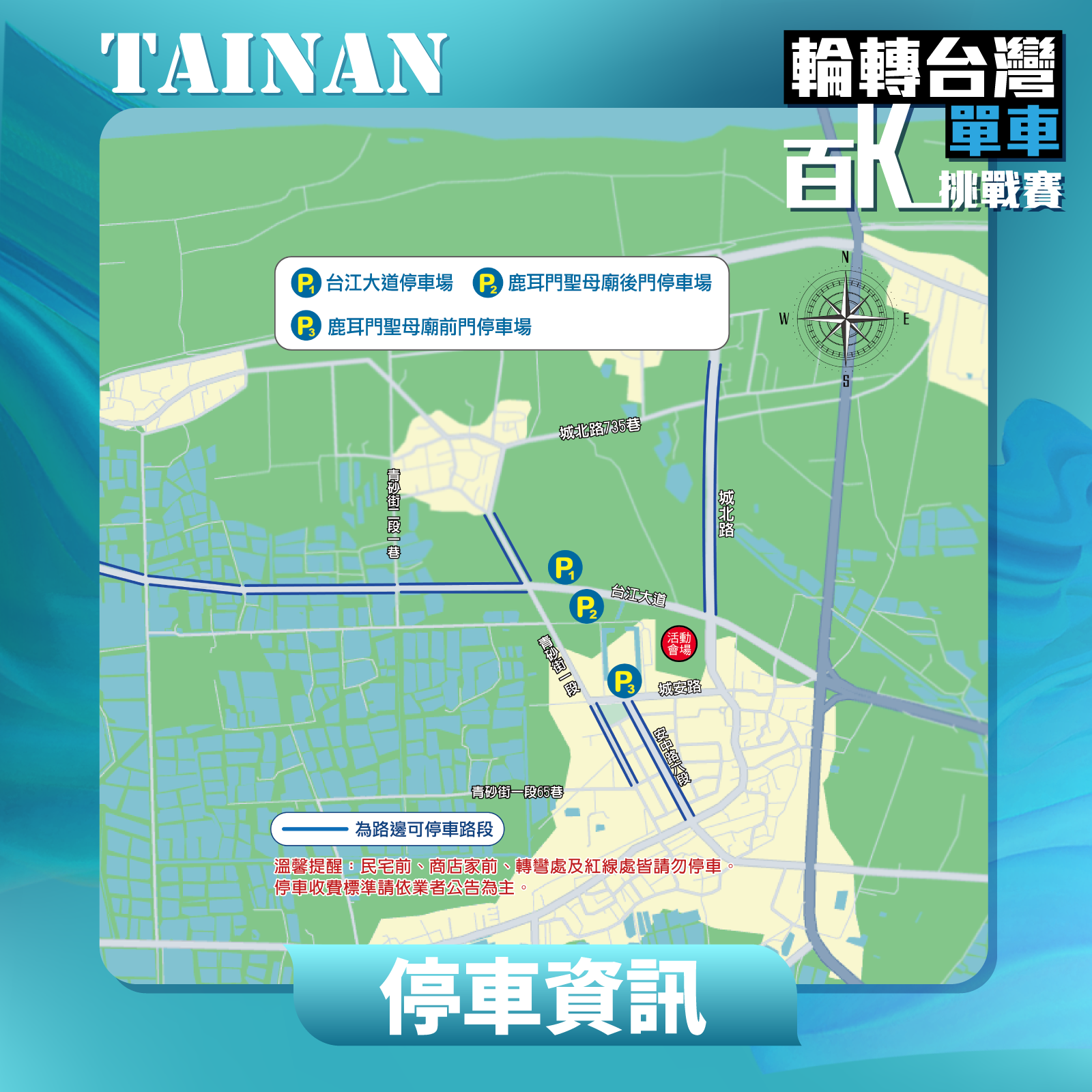 - 停車注意事項:因活動起跑前跑者人數眾多,為確保您順利停車並準時參加活動,請跑者提前一小時以上到達會場,以避免尋找車位錯過起跑時間,請遵循以下停車指引停放您的愛車,並請善用搭乘大眾交通工具,確保順利抵達會場,感謝您的合作!