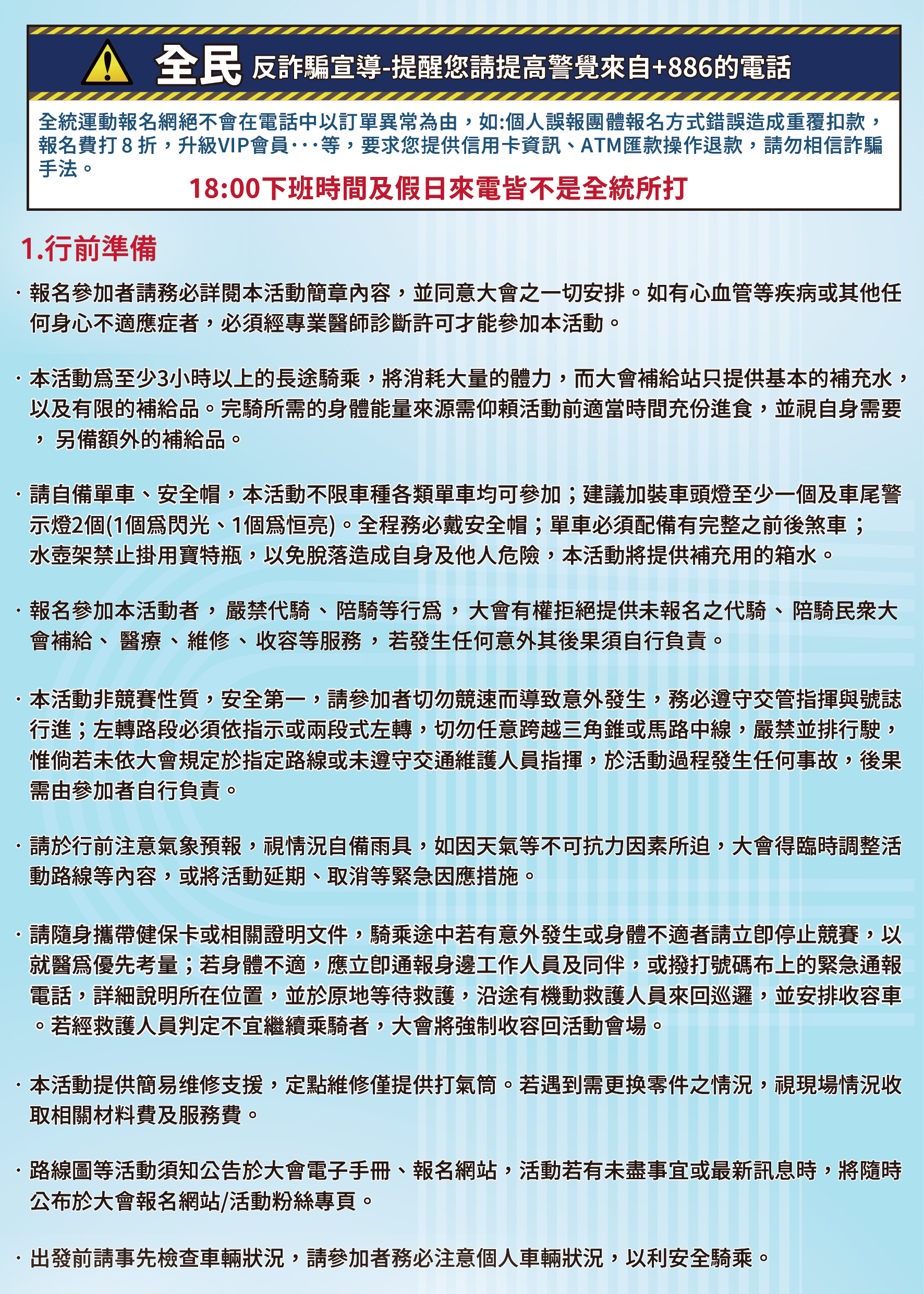 ※6.本活動為參加者投保特定活動保險以及公共意外責任險,建議參加者視個人情況自行加買個人保險或車險(依保險法規定,但因個人體質、疾病或未遵守交通號誌等交通過規範,所導致之傷害不在本活動保險受理範圍之內)。
