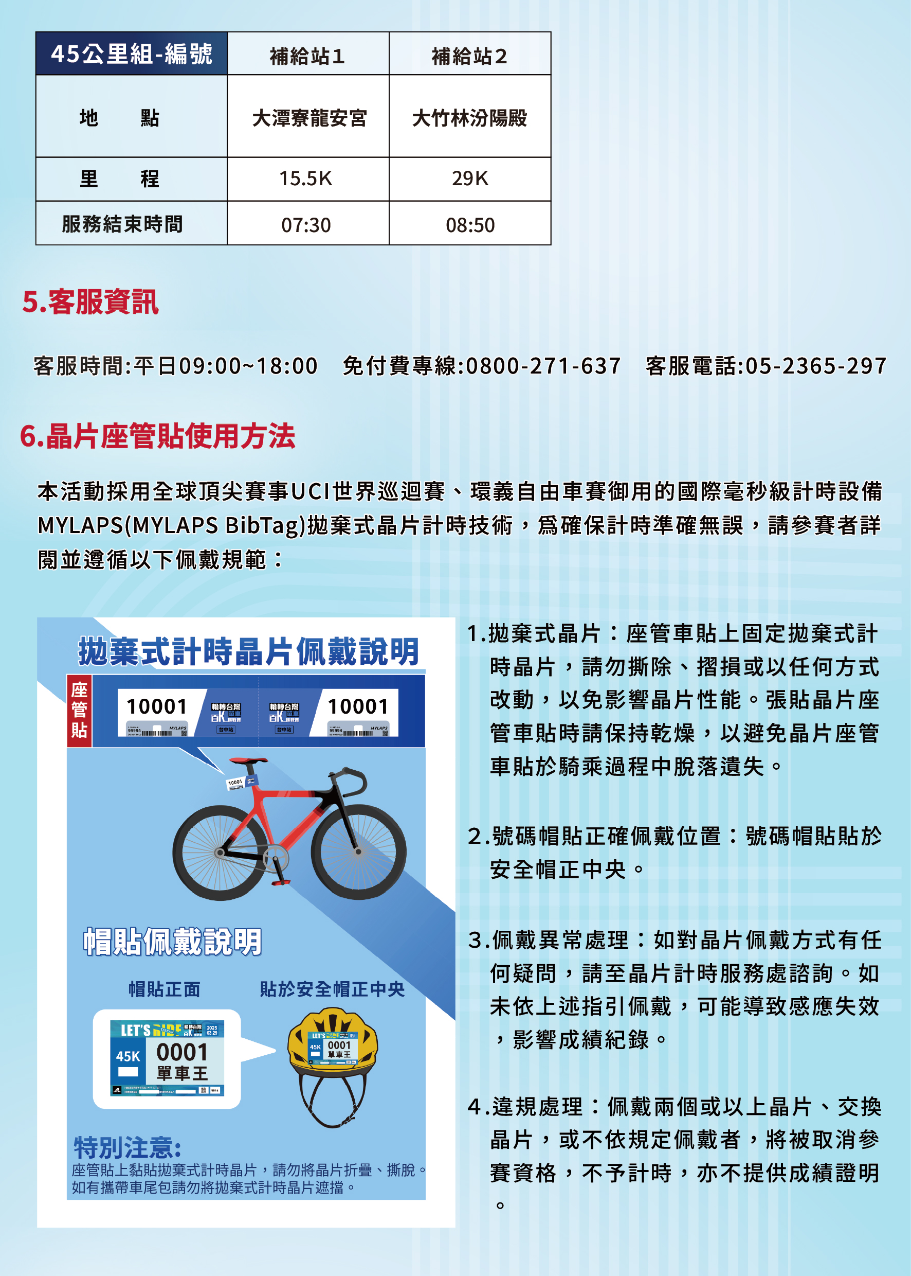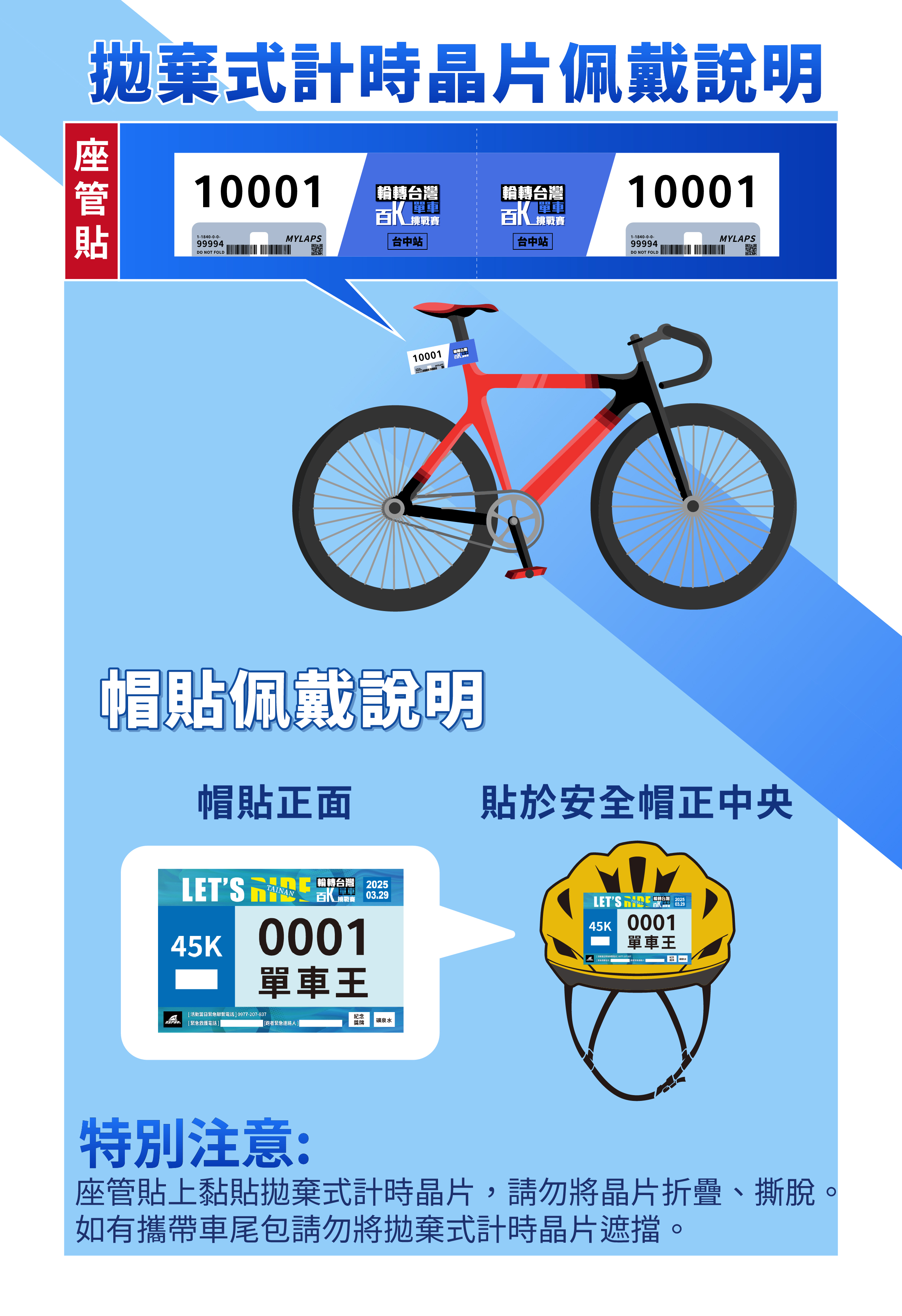 - 拋棄式晶片:座管車貼上固定拋棄式計時晶片,請勿撕除、摺損或以任何方式改動,以免影響晶片性能。張貼晶片座管車貼時請保持乾燥,以避免晶片座管車貼於騎乘過程中脫落遺失。