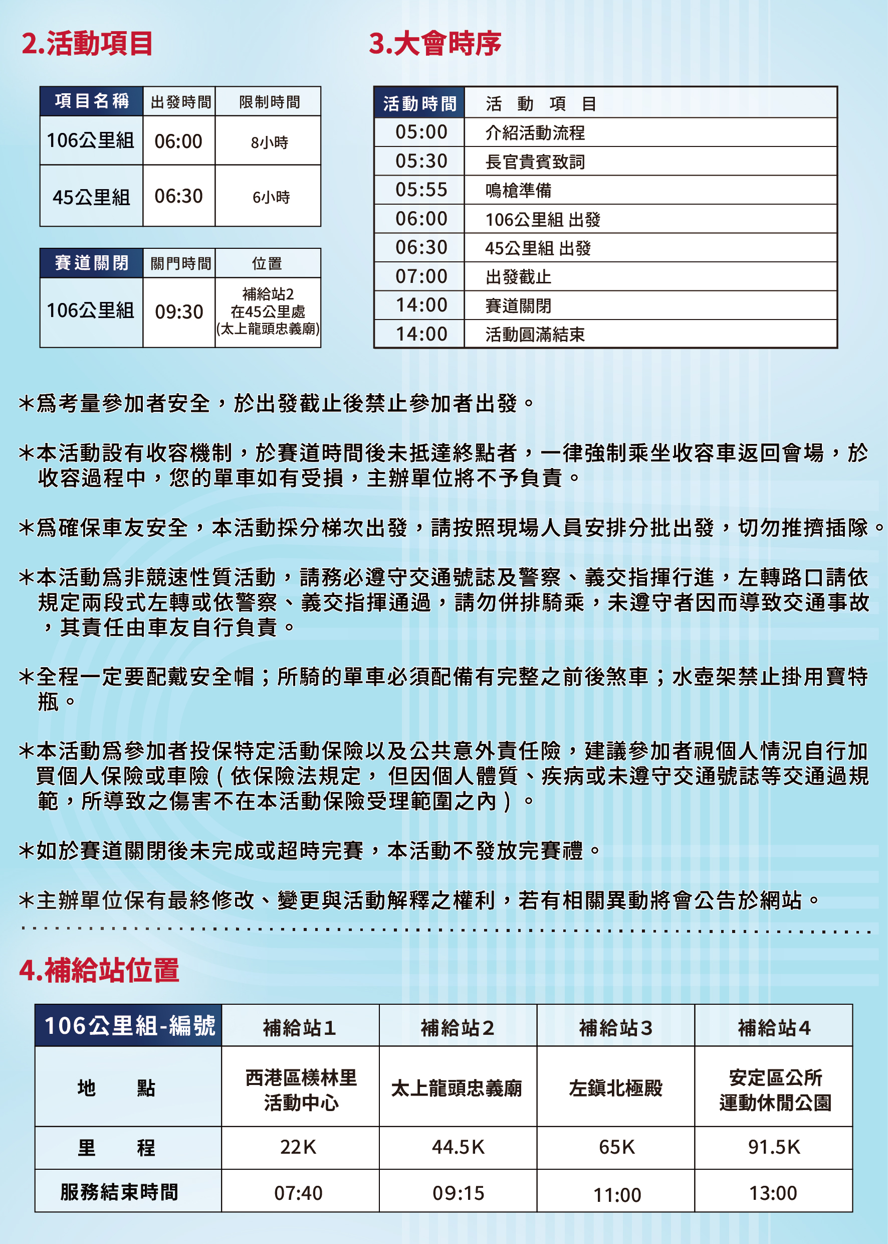 ※2.本活動設有收容機制,於賽道時間後未抵達終點者,一律強制乘坐收容車返回會場,於收容過程中,您的單車如有受損,主辦單位將不予負責。