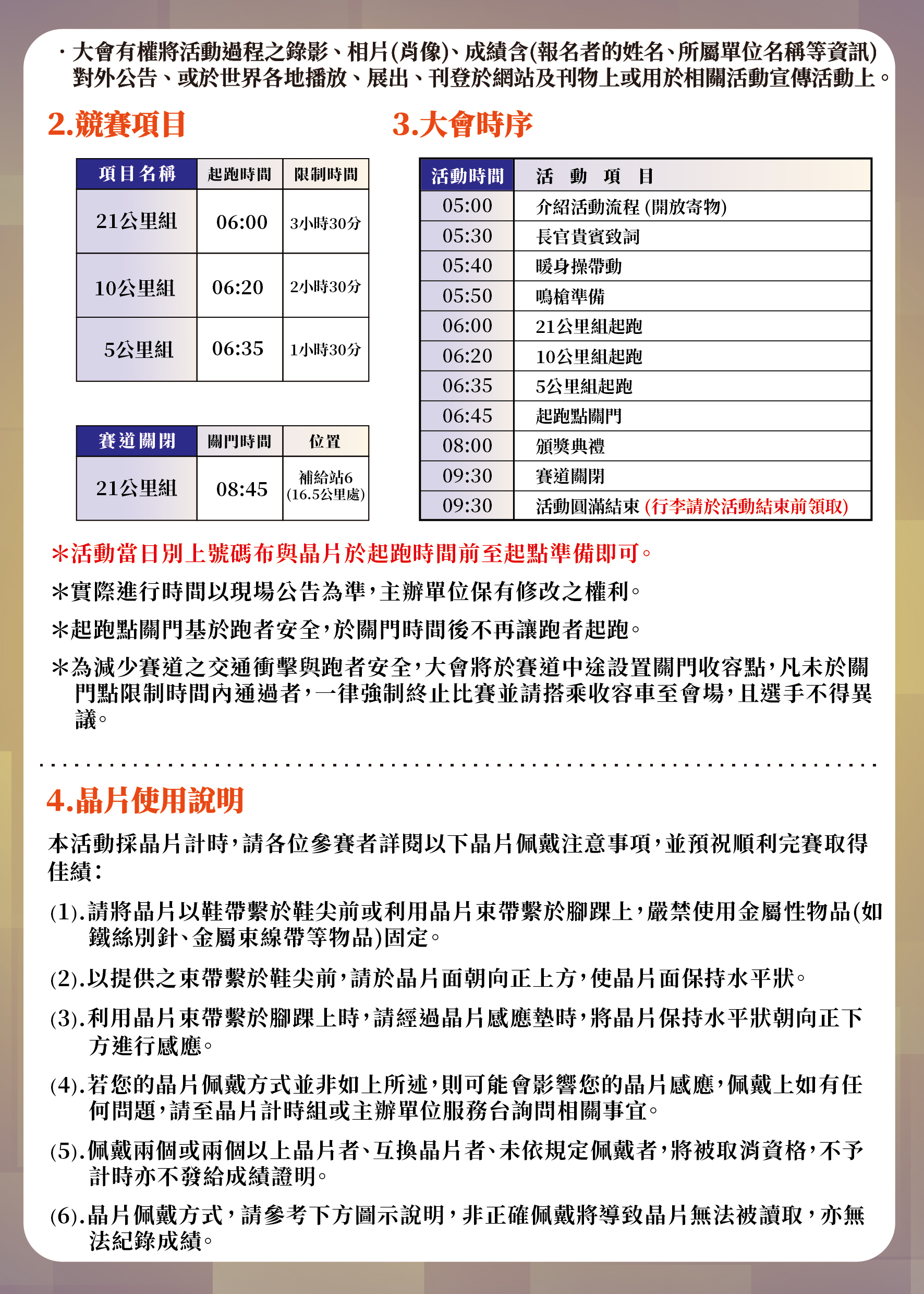 ※為減少賽道之交通衝擊與跑者安全,大會將於賽道中途設置關門收容點,凡未於關門點限制時間內通過者,一律強制終止比賽並請搭乘收容車至會場,且選手不得異議。