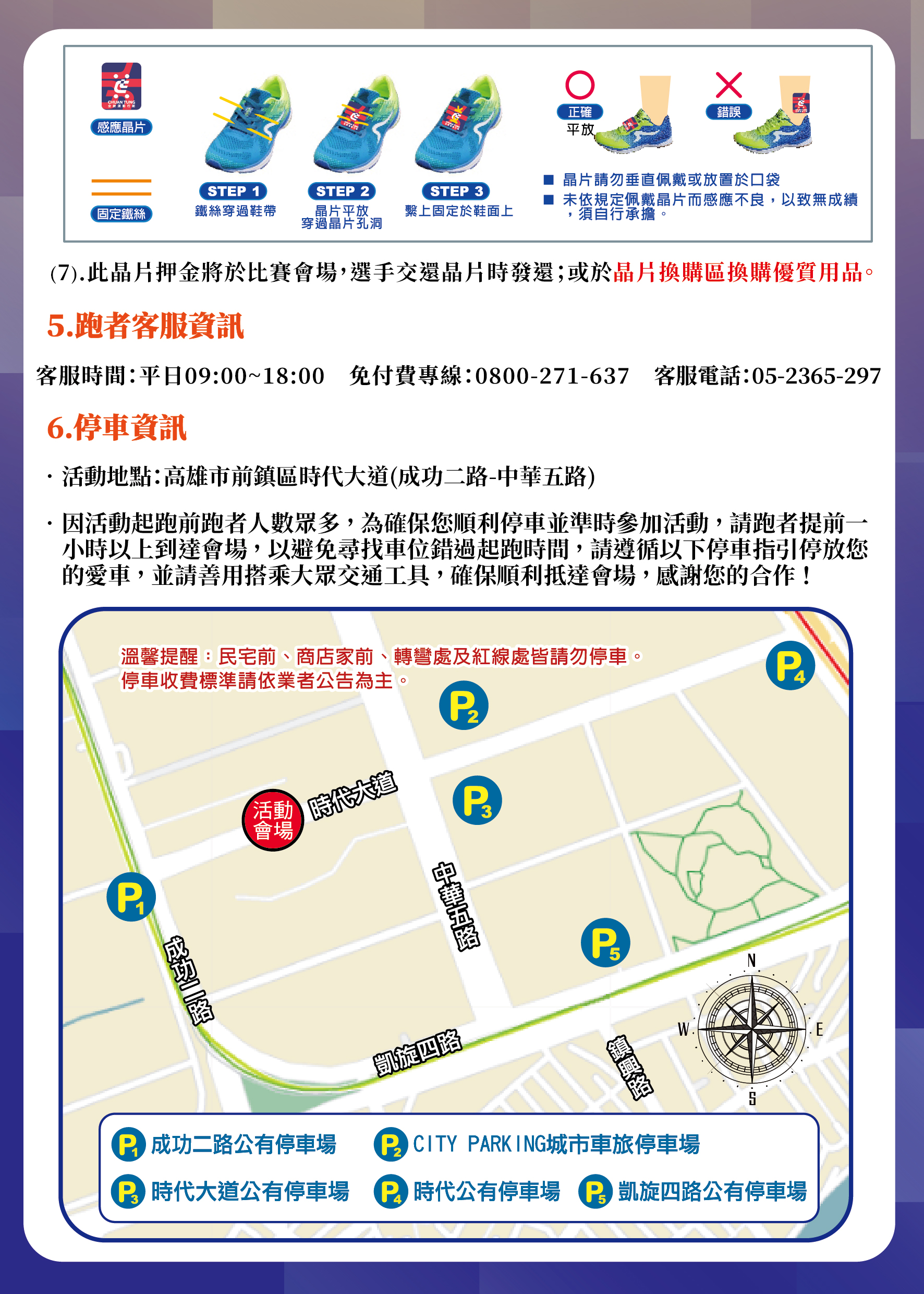 - 停車注意事項:因活動起跑前跑者人數眾多,為確保您順利停車並準時參加活動,請跑者提前一小時以上到達會場,以避免尋找車位錯過起跑時間,請遵循以下停車指引停放您的愛車,並請善用搭乘大眾交通工具,確保順利抵達會場,感謝您的合作!
