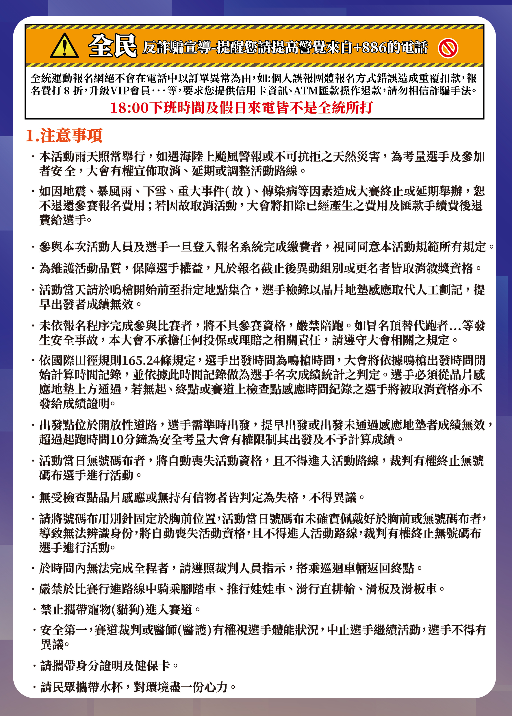 - 晶片、號碼布若有缺漏請最慢於活動前三日致電全統報名網客服反應登記,否則一律視為遺失處理現場不補發。