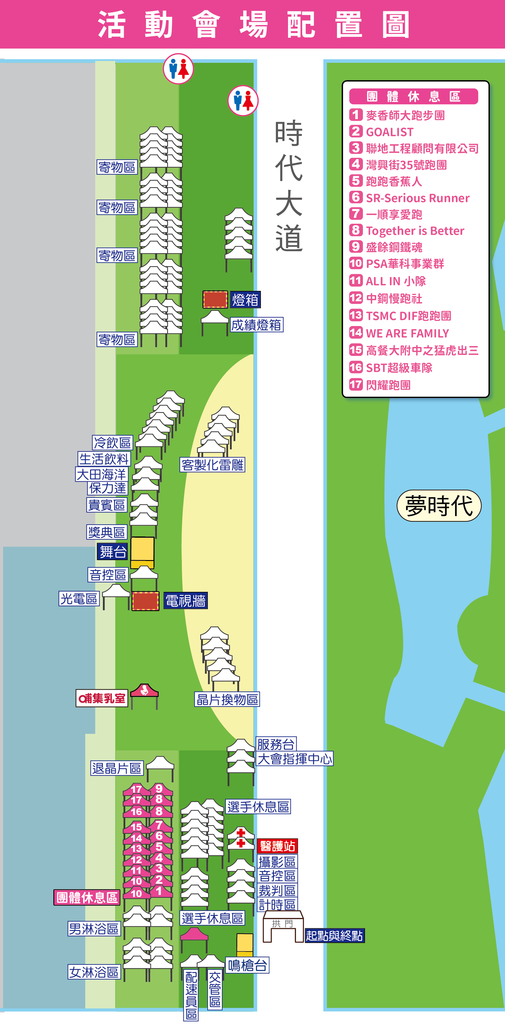 3.「晶片換購區」憑晶片可換購優質商品。 - 符合繳費前20頂「團體休息帳」之團體同時可獲得活動品牌專屬團隊旗幟,依據報名時登記團名製作,團旗將由大會直接懸掛於團體休息帳,活動結束後可自行拆下帶回,團體休息帳安排如下。