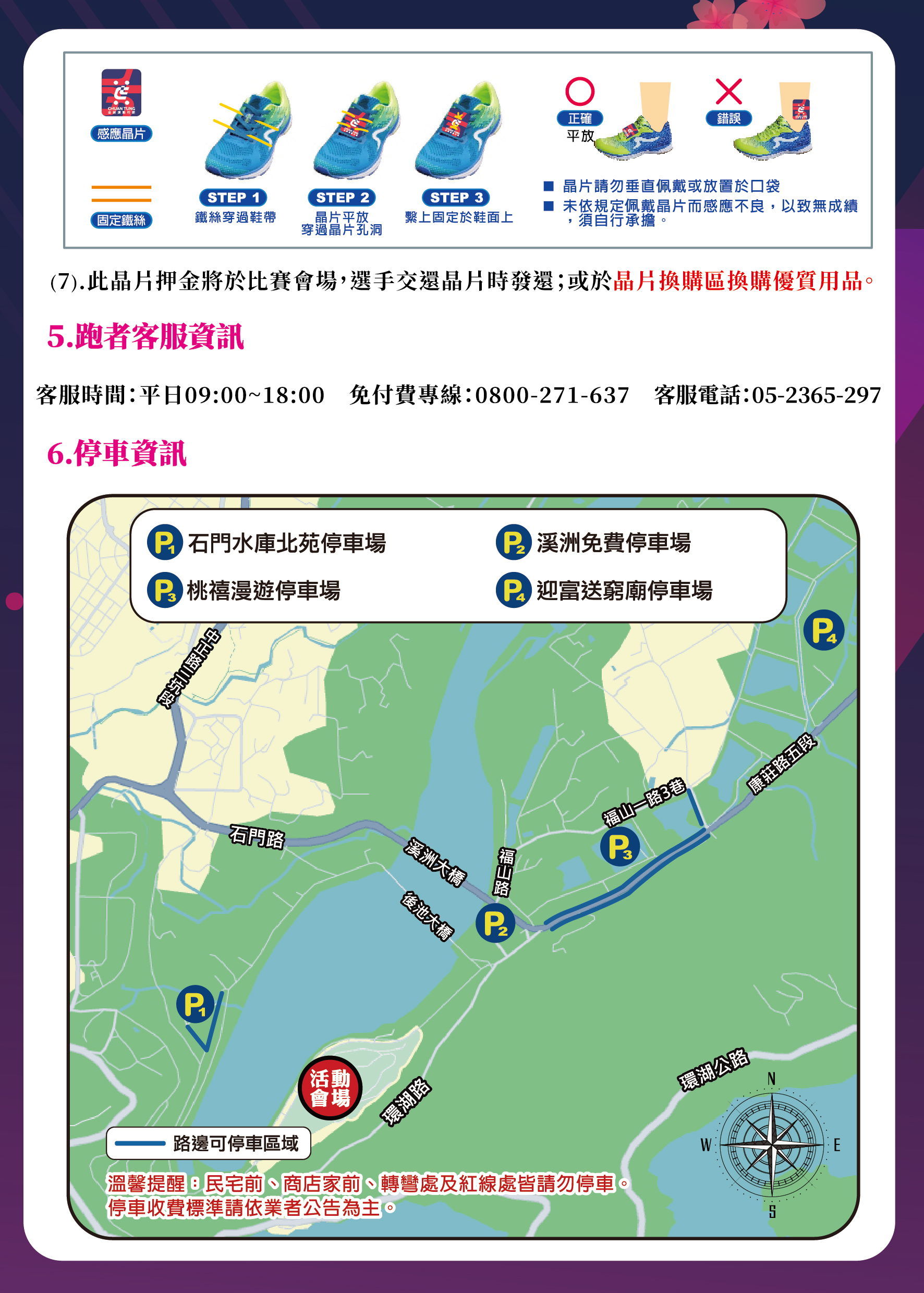 - 晶片、號碼布若有缺漏請最慢於活動前三日致電全統報名網客服反應登記,否則一律視為遺失處理現場不補發。