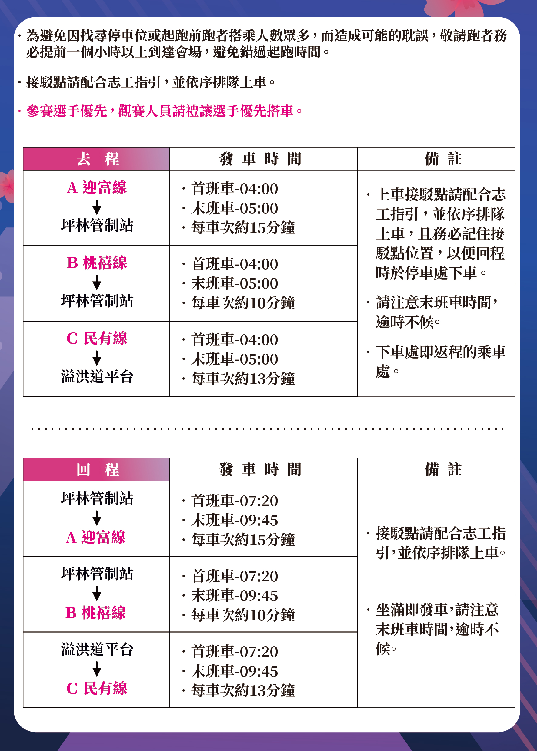 - 參賽選手優先,觀賽人員請禮讓選手優先搭車。
