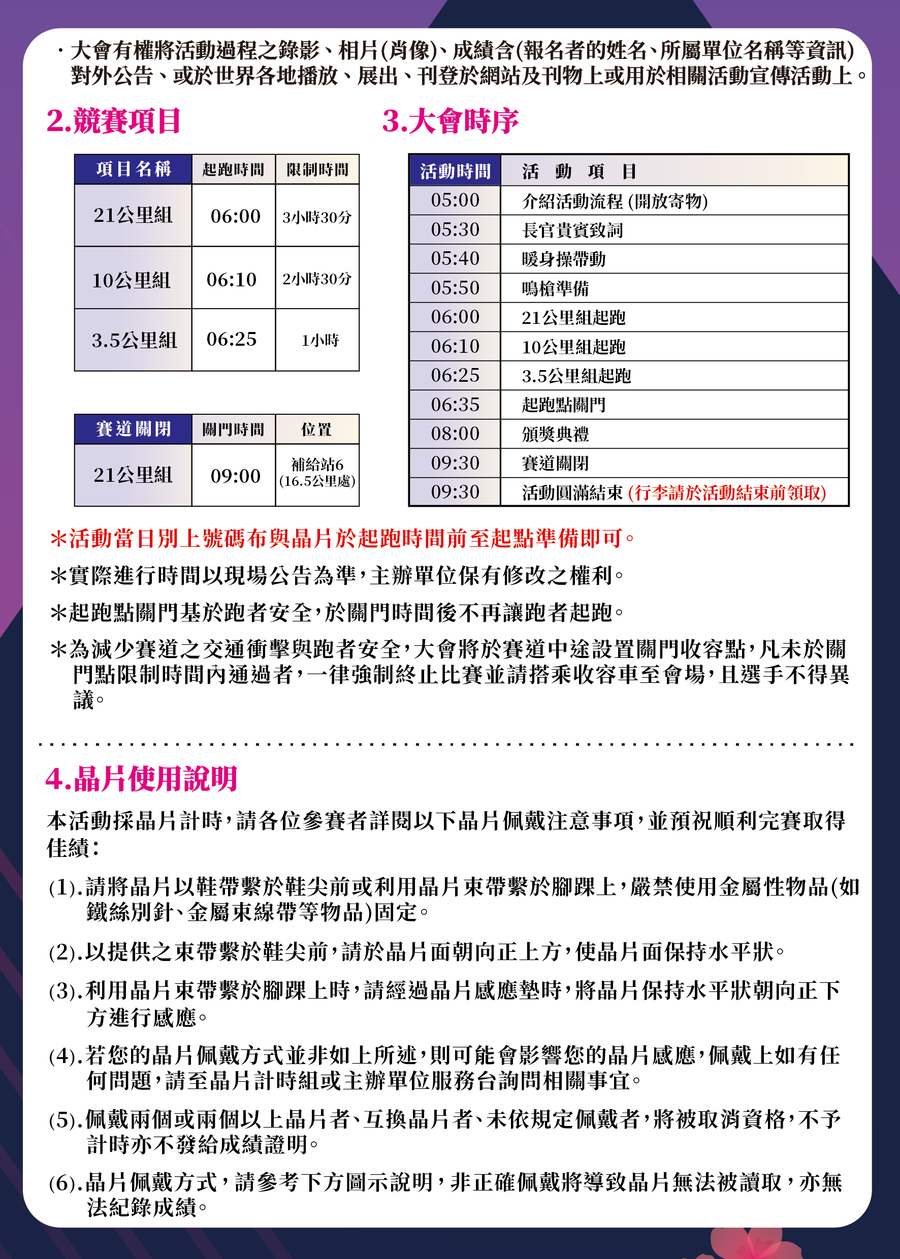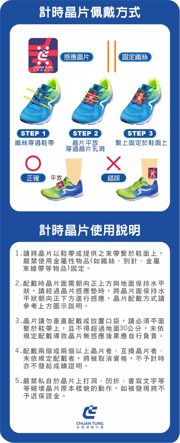 - 晶片異常以及晶片相關問題,請至「成績異常區/裁判區」帳篷處理,申請補發晶片請於第一組公里數開跑前30分鐘辦理,未提前30分申請恕不補發晶片,辦理時需出示報名人的(身分證件),並另付押金100元。(活動後可退還)。
