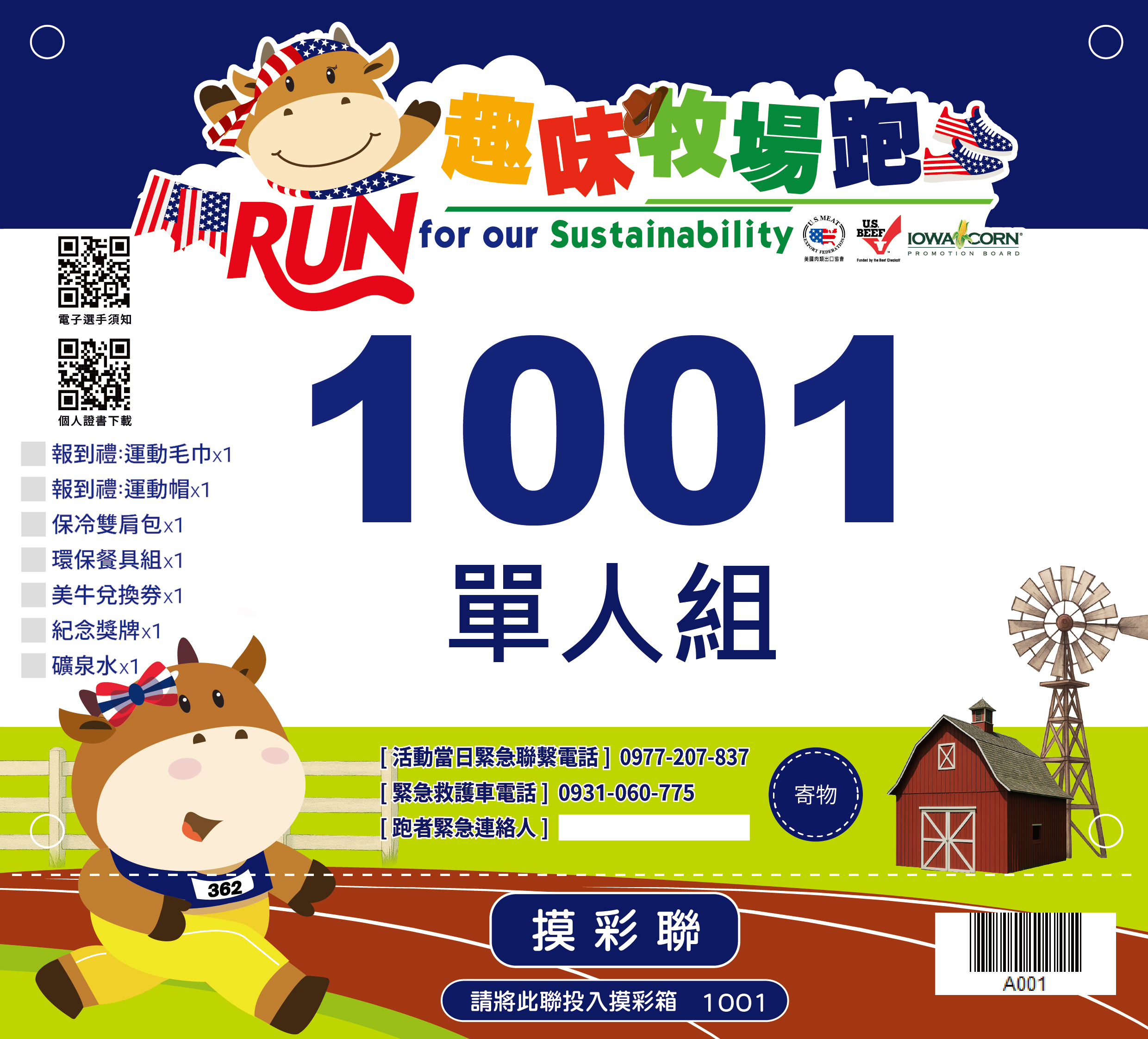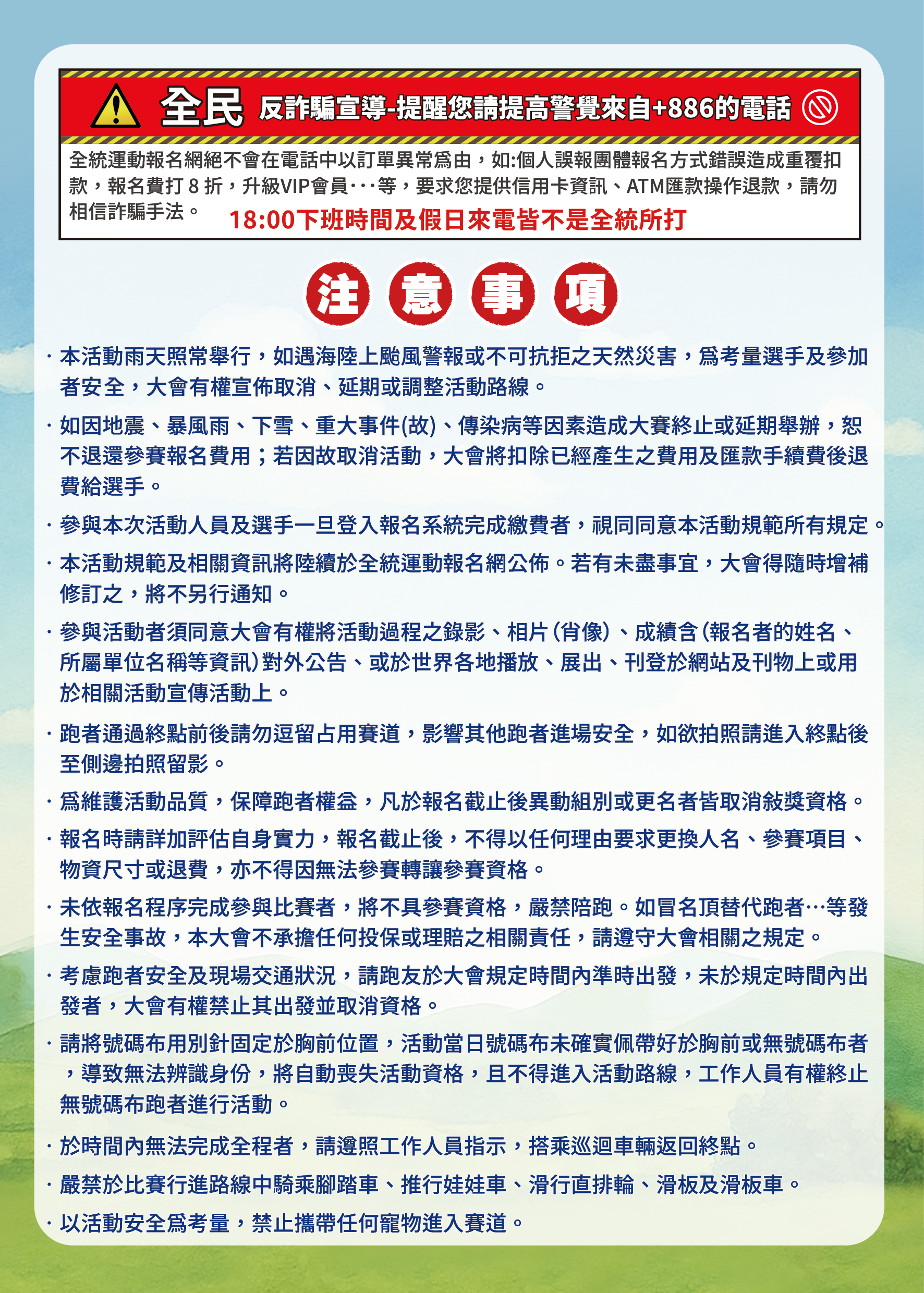 - 物資、號碼布若有缺漏請最慢於活動前三日致電全統報名網客服反應登記,否則一律視為遺失處理現場不補發。