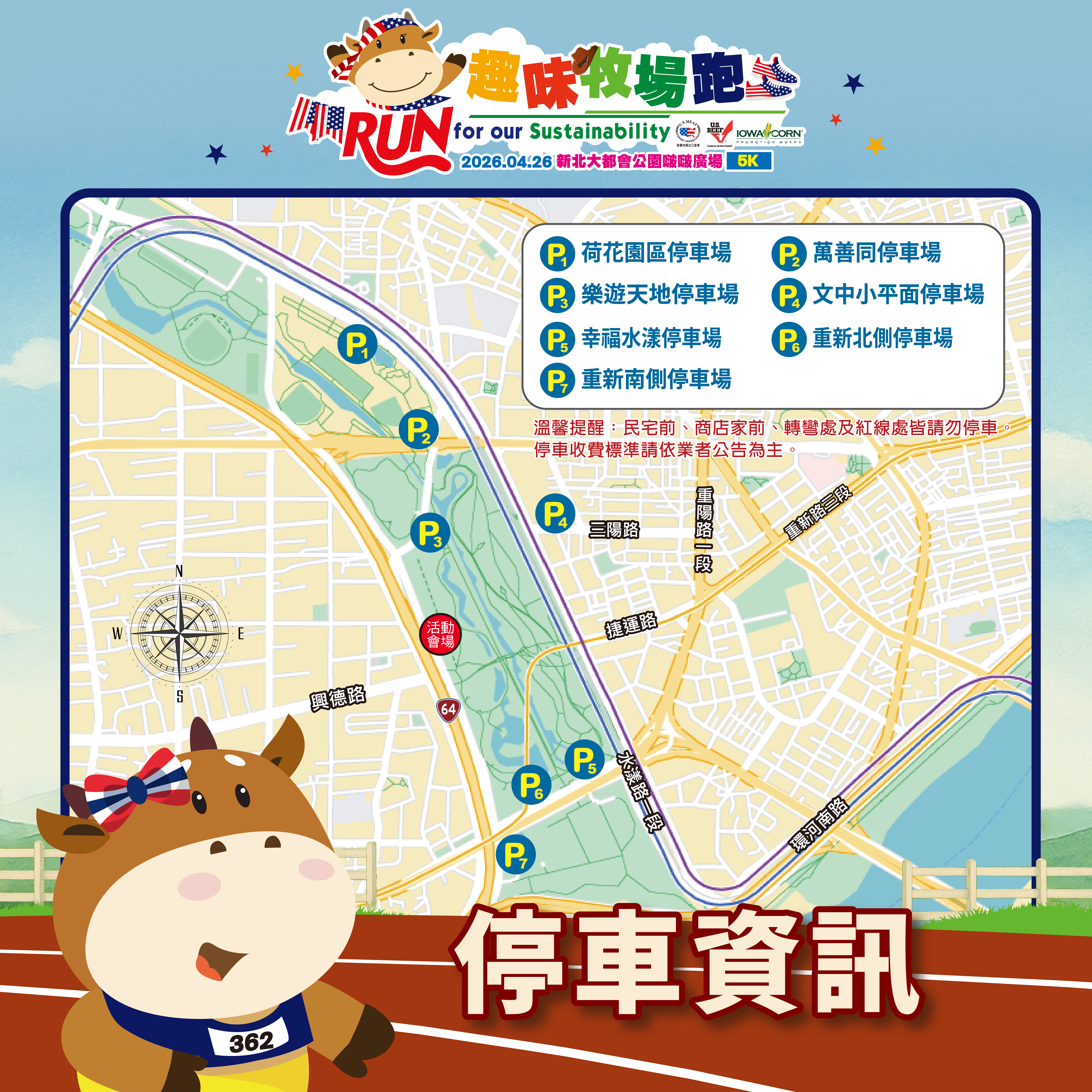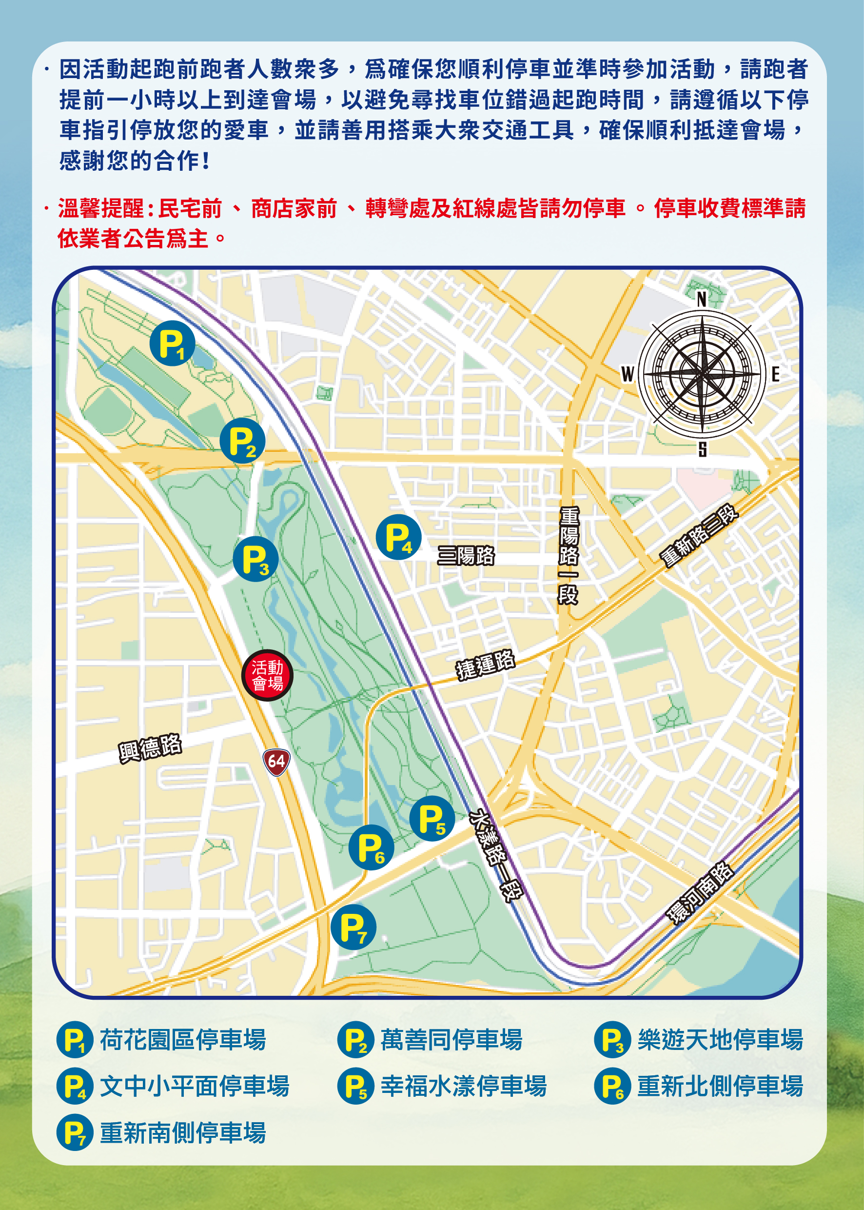 - 因活動起跑前跑者人數眾多,為確保您順利停車並準時參加活動,請跑者提前一小時以上到達會場,以避免尋找車位錯過起跑時間,請遵循以下停車指引停放您的愛車,並請善用搭乘大眾交通工具,確保順利抵達會場,感謝您的合作!