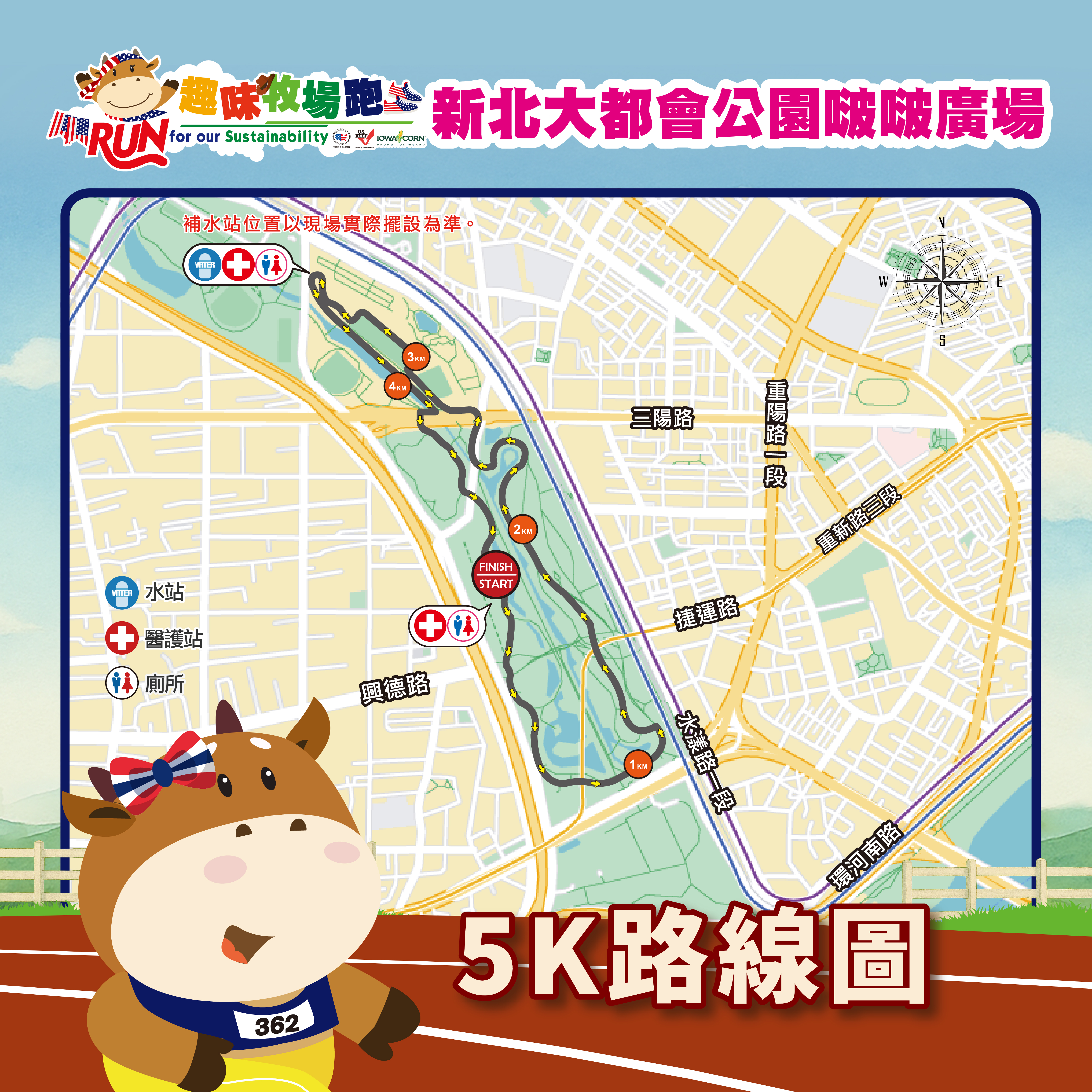 路線:起跑(START)→經婚紗廣場→經河岸鐘樓→經自行車辰光租借站→經愛心走廊→經中山壘球場→經荷花公園籃球場→迴轉→經樂遊天地→終點(FINISH)