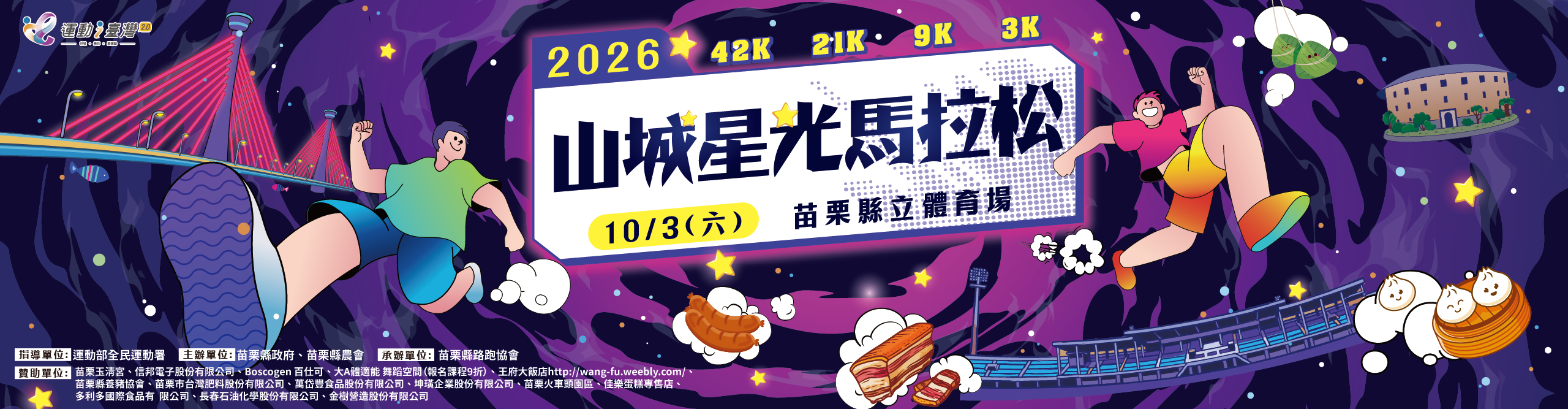 | 贊助單位 | 苗栗玉清宮、信邦電子股份有限公司、Boscogen 百仕可、大A體適能舞蹈空間(報名課程9折)、王府大飯店 http://wang-fu.weebly.com/ 、苗栗縣養豬協會、苗栗市台灣肥料股份有限公司、萬岱豐食品股份有限公司、坤璜企業股份有限公司、苗栗火車頭園區、佳樂蛋糕專售店、多利多國際食品有限公司、長春石油化學股份有限公司、金樹營造股份有限公司 |