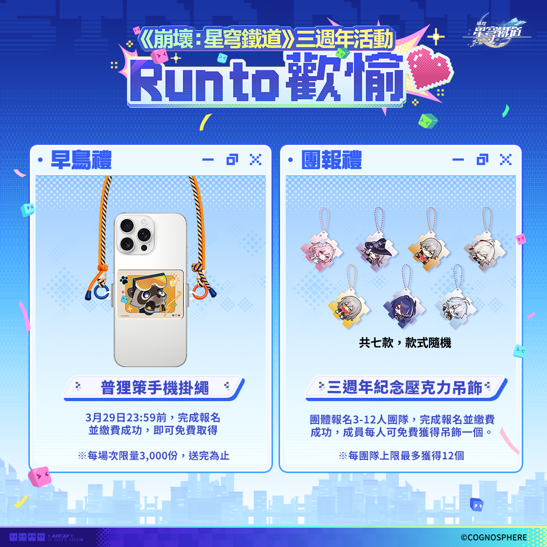 3人團報禮:「三週年紀念壓克力吊飾」1 個,每團隊上限最多獲得12個。